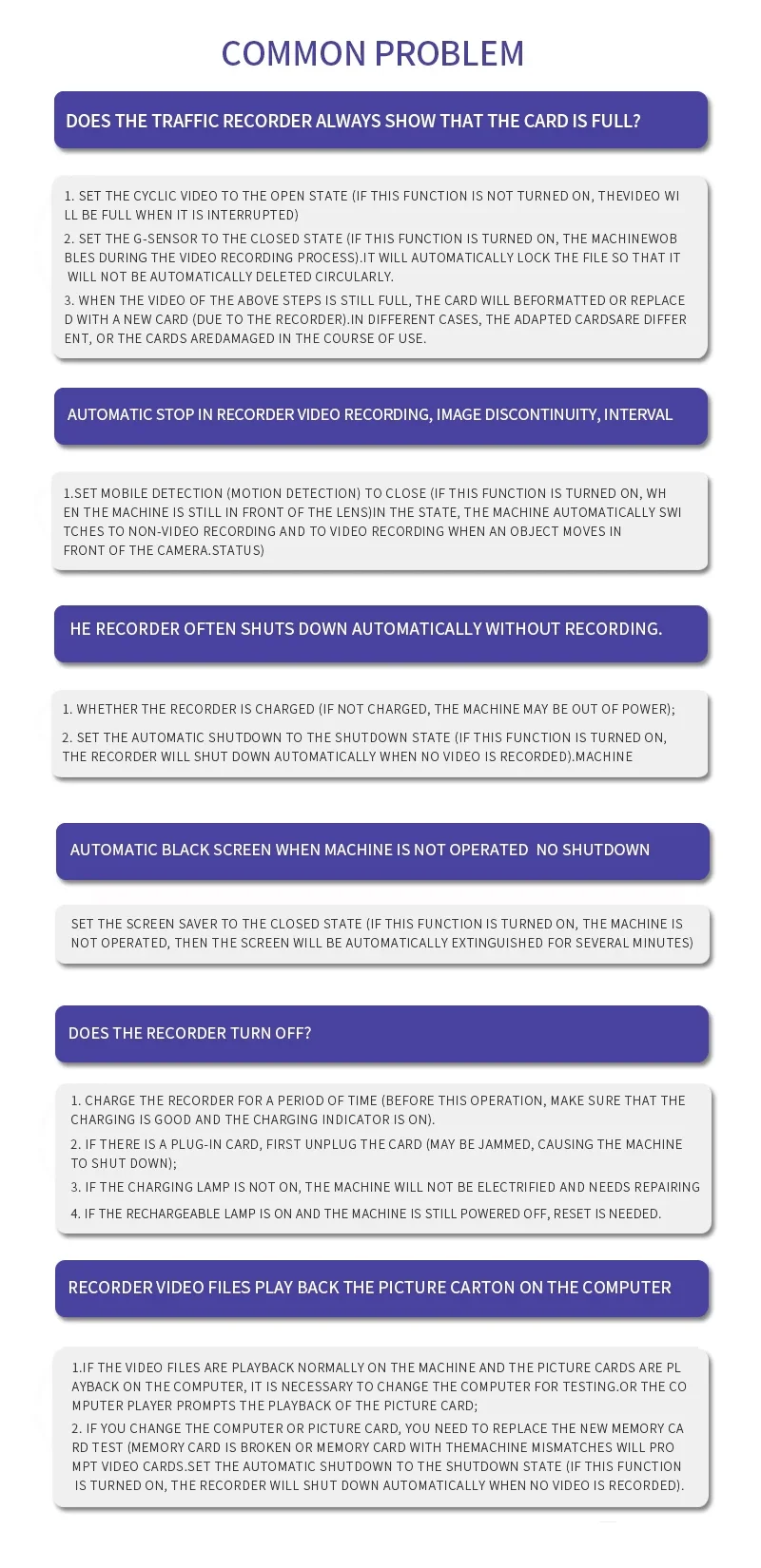 3. When the memory card is full, the loop will overwrite the oldest image with the newest image, but will skip the emergency locked video (the locked file will not be overwritten).